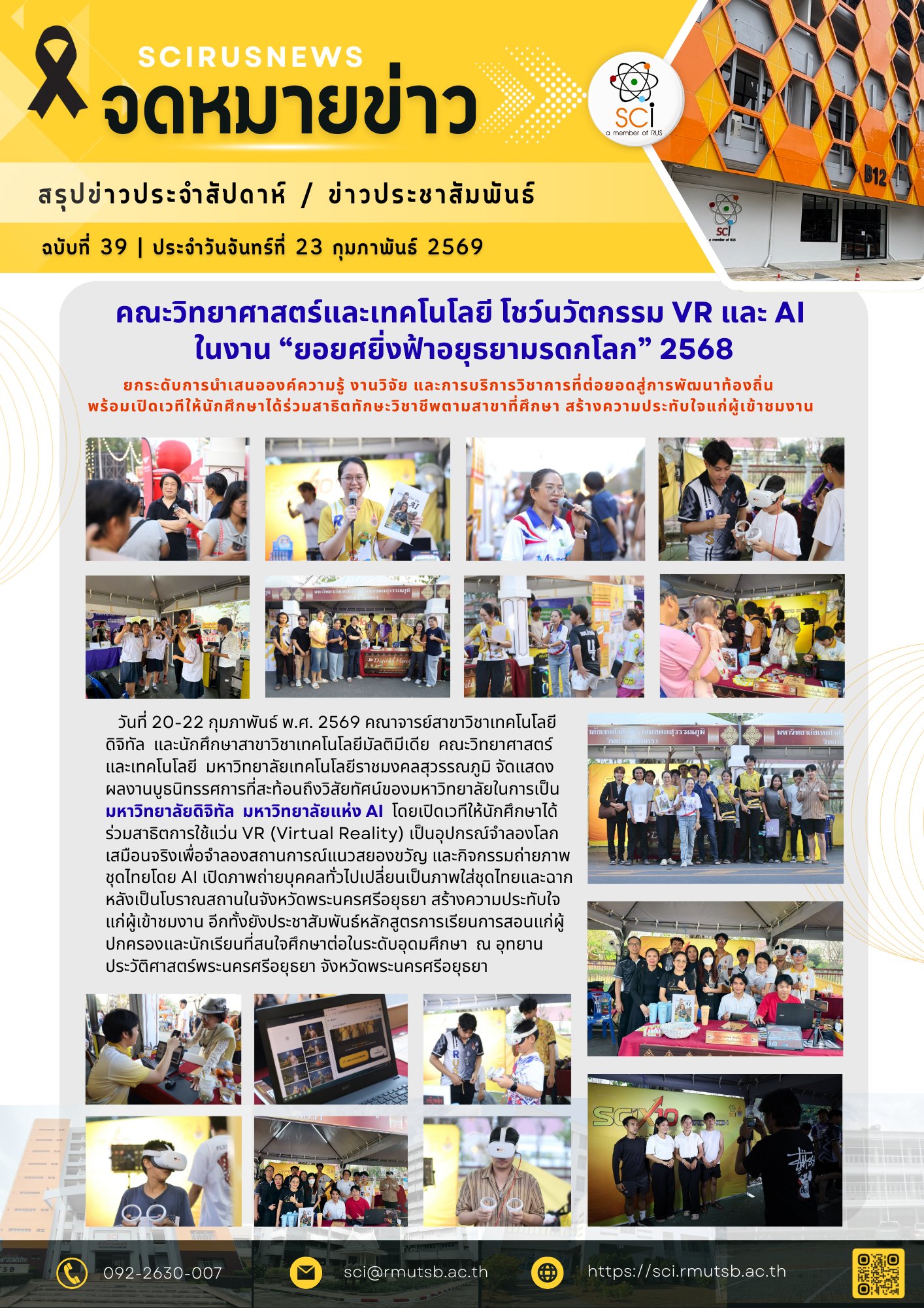 วันที่ 20-22 กุมภาพันธ์ พ.ศ. 2569 คณาจารย์สาขาวิชาเทคโนโลยีดิจิทัล และนักศึกษาสาขาวิชาเทคโนโลยีมัลติมีเดีย คณะวิทยาศาสตร์ และเทคโนโลยี มหาวิทยาลัยเทคโนโลยีราชมงคลสุวรรณภูมิ จัดแสดงผลงานบูธนิทรรศการที่สะท้อนถึงวิสัยทัศน์ของมหาวิทยาลัยในการเป็นมหาวิทยาลัยดิจิทัล มหาวิทยาลัยแห่ง AI โดยเปิดเวทีให้นักศึกษาได้ร่วมสาธิตการใช้แว่น VR (Virtual Reality) เป็นอุปกรณ์จำลองโลกเสมือนจริงเพื่อจำลองสถานการณ์แนวสยองขวัญ และกิจกรรมถ่ายภาพชุดไทยโดย AI เปิดภาพถ่ายบุคคลทั่วไปเปลี่ยนเป็นภาพใส่ชุดไทยและฉากหลังเป็นโบราณสถานในจังหวัดพระนครศรีอยุธยา สร้างความประทับใจแก่ผู้เข้าชมงาน อีกทั้งยังประชาสัมพันธ์หลักสูตรการเรียนการสอนแก่ผู้ปกครองและนักเรียนที่สนใจศึกษาต่อในระดับอุดมศึกษา ณ อุทยานประวัติศาสตร์พระนครศรีอยุธยา จังหวัดพระนครศรีอยุธยา