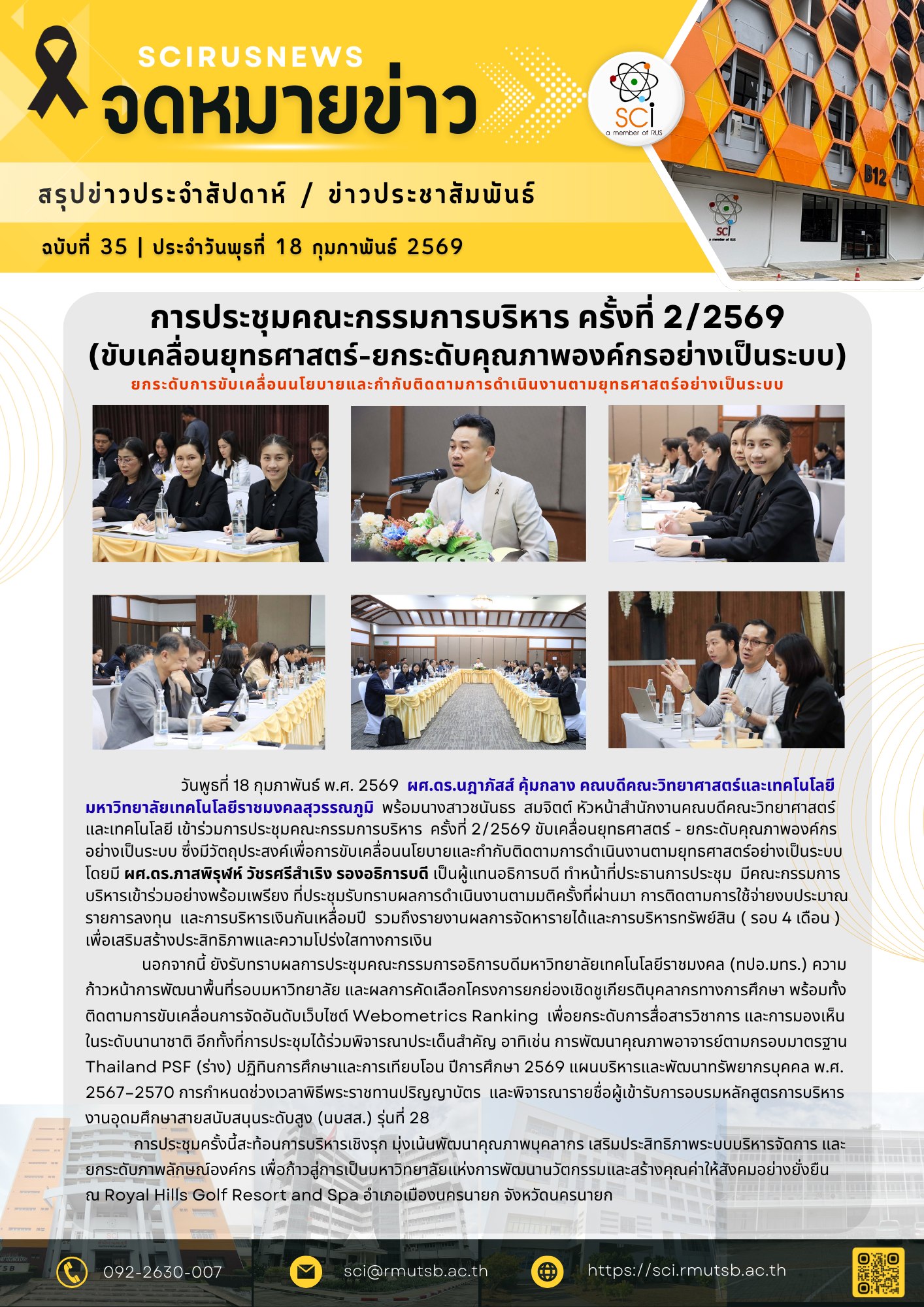 วันพูธที่ 18 กุมภาพันธ์ พ.ศ. 2569 ผศ.ดร.นฎาภัสส์ คุ้มกลาง คณบดีคณะวิทยาศาสตร์และเทคโนโลยี มหาวิทยาลัยเทคโนโลยีราชมงคลสุวรรณภูมิ พร้อมนางสาวชนันธร สมจิตต์ หัวหน้าสำนักงานคณบดีคณะวิทยาศาสตร์และเทคโนโลยี เข้าร่วมการประชุมคณะกรรมการบริหาร ครั้งที่ 2/2569 ขับเคลื่อนยุทธศาสตร์-ยกระดับคุณภาพองค์กรอย่างเป็นระบบ ซึ่งมีวัตถุประสงค์เพื่อการขับเคลื่อนนโยบายและกำกับติดตามการดำเนินงานตามยุทธศาสตร์อย่างเป็นระบบ โดยมี ผศ.ดร.ภาสพิรุฬห์ วัชรศรีสำเริง รองอธิการบดี เป็นผู้แทนอธิการบดี ทำหน้าที่ประธานการประชุม มีคณะกรรมการบริหารเข้าร่วมอย่างพร้อมเพรียง ที่ประชุมรับทราบผลการดำเนินงานตามมติครั้งที่ผ่านมา การติดตามการใช้จ่ายงบประมาณ รายการลงทุน และการบริหารเงินกันเหลื่อมปี รวมถึงรายงานผลการจัดหารายได้และการบริหารทรัพย์สิน ( รอบ 4 เดือน ) เพื่อเสริมสร้างประสิทธิภาพและความโปร่งใสทางการเงิน