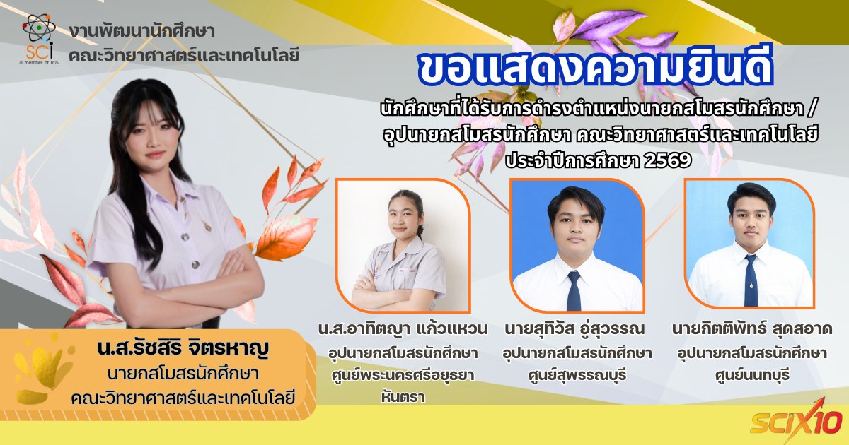 นายกสโมสรนักศึกษา และอุปนายกสโมสรนักศึกษา คณะวิทยาศาสตร์และเทคโนโลยี ประจำปีการศึกษา 2569 ดังนี้นายกสโมสรนักศึกษา