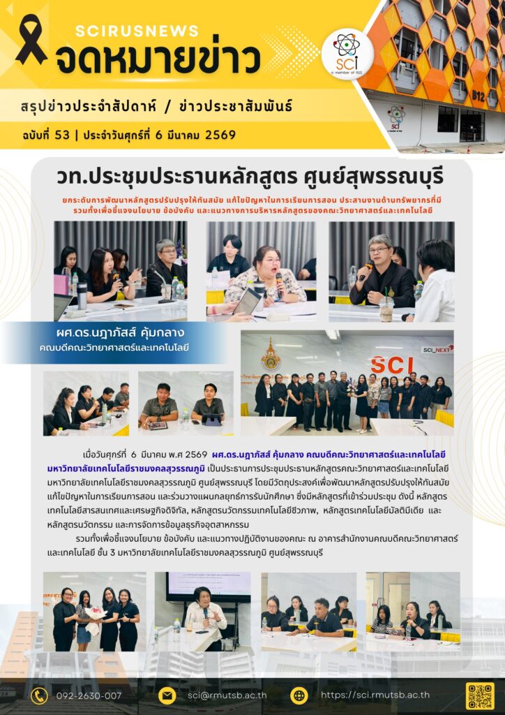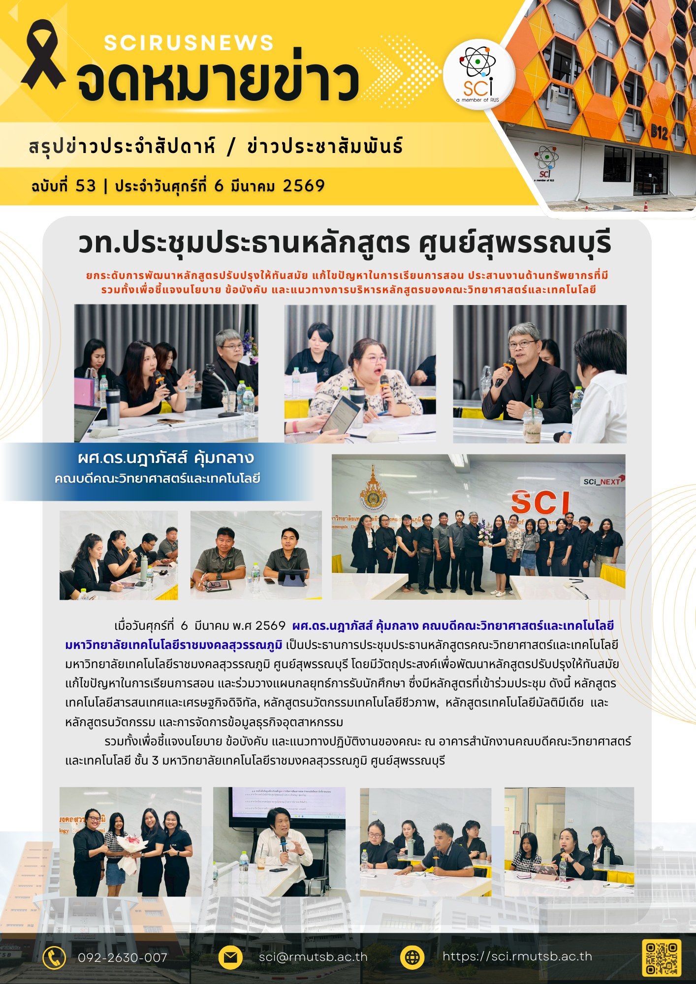 เมื่อวันศุกร์ที่ 6 มีนาคม พ.ศ 2569 ผศ.ดร.นฎาภัสส์ คุ้มกลาง คณบดีคณะวิทยาศาสตร์และเทคโนโลยี มหาวิทยาลัยเทคโนโลยีราชมงคลสุวรรณภูมิ เป็นประธานการประชุมประธานหลักสูตรคณะวิทยาศาสตร์และเทคโนโลยี มหาวิทยาลัยเทคโนโลยีราชมงคลสุวรรณภูมิ ศูนย์สุพรรณบุรี โดยมีวัตถุประสงค์เพื่อพัฒนาหลักสูตรปรับปรุงให้ทันสมัย แก้ไขปัญหาในการเรียนการสอน และร่วมวางแผนกลยุทธ์การรับนักศึกษา ซึ่งมีหลักสูตรที่เข้าร่วมประชุม ดังนี้ หลักสูตรเทคโนโลยีสารสนเทศและเศรษฐกิจดิจิทัล, หลักสูตรนวัตกรรมเทคโนโลยีชีวภาพ, หลักสูตรเทคโนโลยีมัลติมีเดีย และหลักสูตรนวัตกรรม และการจัดการข้อมูลธุรกิจอุตสาหกรรม