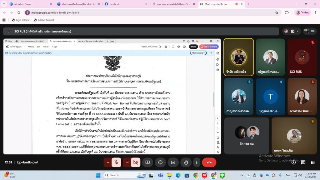 วันพฤหัสบดีที่ 12 มีนาคม พ.ศ 2569 ผศ.ดร.นฎาภัสส์ คุ้มกลาง คณบดีคณะวิทยาศาสตร์และเทคโนโลยี มหาวิทยาลัยเทคโนโลยีราชมงคลสุวรรณภูมิ เป็นประธานการประชุมผู้บริหารคณะวิทยาศาสตร์และเทคโนโลยี ผ่านระบบออนไลน์ เพื่อกำหนดแนวทางและมาตรการการปฏิบัติงาน Work From Home ของบุคลากรภายใต้สถานการณ์การสู้รบในตะวันออกกลางที่ส่งผลกระทบต่อวิกฤติพลังงานในประเทศไทย