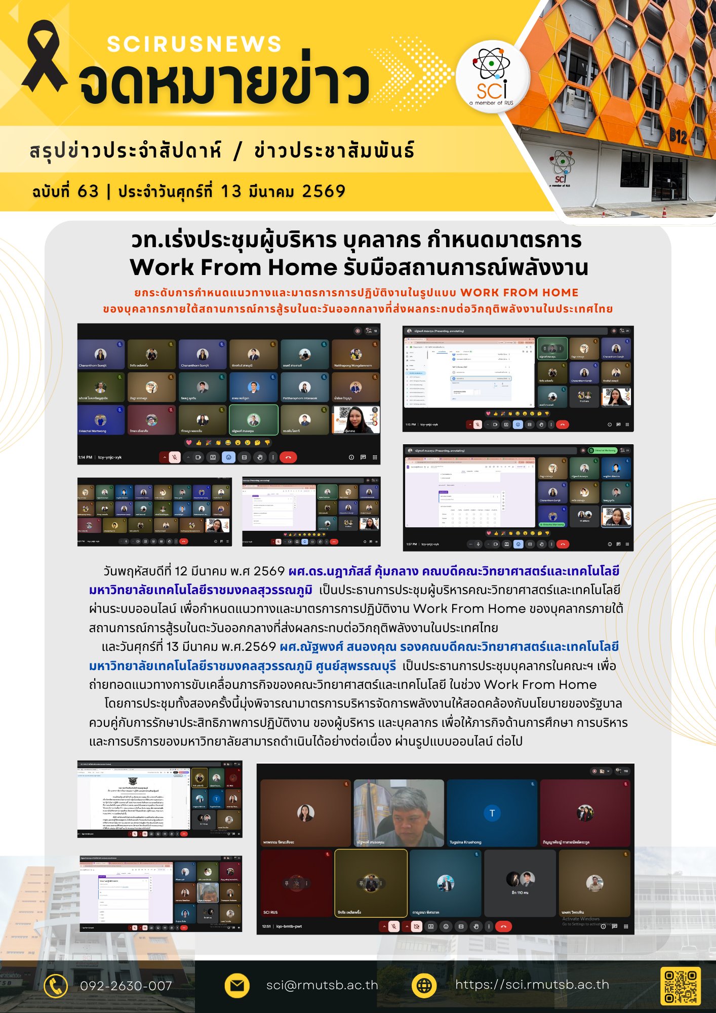 วันพฤหัสบดีที่ 12 มีนาคม พ.ศ 2569 ผศ.ดร.นฎาภัสส์ คุ้มกลาง คณบดีคณะวิทยาศาสตร์และเทคโนโลยี มหาวิทยาลัยเทคโนโลยีราชมงคลสุวรรณภูมิ เป็นประธานการประชุมผู้บริหารคณะวิทยาศาสตร์และเทคโนโลยี ผ่านระบบออนไลน์ เพื่อกำหนดแนวทางและมาตรการการปฏิบัติงาน Work From Home ของบุคลากรภายใต้สถานการณ์การสู้รบในตะวันออกกลางที่ส่งผลกระทบต่อวิกฤติพลังงานในประเทศไทย