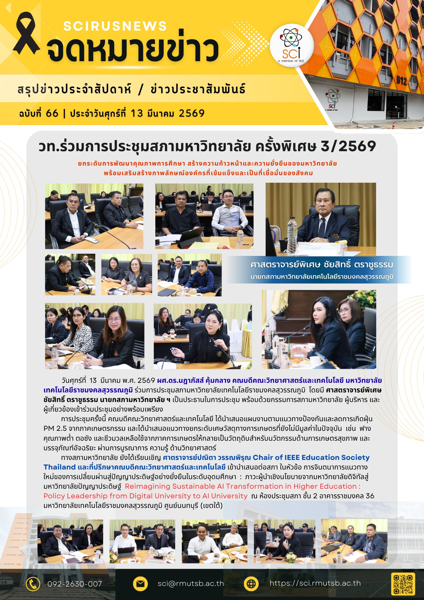 วันศุกร์ที่ 13 มีนาคม พ.ศ. 2569 ผศ.ดร.นฎาภัสส์ คุ้มกลาง คณบดีคณะวิทยาศาสตร์และเทคโนโลยี มหาวิทยาลัยเทคโนโลยีราชมงคลสุวรรณภูมิ ร่วมการประชุมสภามหาวิทยาลัยเทคโนโลยีราชมงคลสุวรรณภูมิ โดยมี ศาสตราจารย์พิเศษชัยสิทธิ์ ตราชูธรรม นายกสภามหาวิทยาลัย ฯ เป็นประธานในการประชุม พร้อมด้วยกรรมการสภามหาวิทยาลัย ผู้บริหาร และผู้เกี่ยวข้องเข้าร่วมประชุมอย่างพร้อมเพรียง