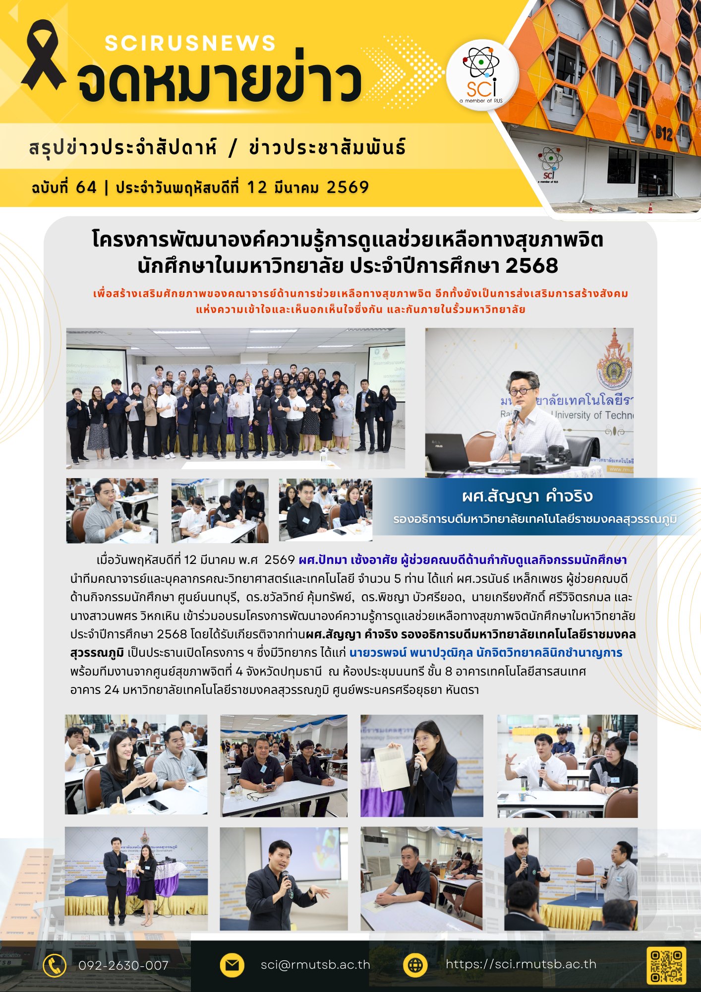 วันพฤหัสบดีที่ 12 มีนาคม พ.ศ 2569 ผศ.ปัทมา เซ้งอาศัย ผู้ช่วยคณบดีด้านกำกับดูแลกิจกรรมนักศึกษา นำทีมคณาจารย์และบุคลากรคณะวิทยาศาสตร์และเทคโนโลยี จำนวน 5 ท่าน ได้แก่ ผศ.วรนันธ์ เหล็กเพชร ผู้ช่วยคณบดีด้านกิจกรรมนักศึกษา ศูนย์นนทบุรี, ดร.ชวัลวิทย์ คุ้มทรัพย์, ดร.พิชญา บัวศรียอด, นายเกรียงศักดิ์ ศรีวิจิตรกมล และนางสาว นพศร วิหกเหิน ได้เข้าร่วมอบรมโครงการพัฒนาองค์ความรู้การดูแลช่วยเหลือทางสุขภาพจิตนักศึกษาในมหาวิทยาลัย ประจำปีการศึกษา 2568 โดยได้รับเกียรติจาก ผศ.สัญญา คำจริง รองอธิการบดีมหาวิทยาลัยเทคโนโลยีราชมงคลสุวรรณภูมิ เป็นประธานเปิดโครงการ ฯ ซึ่งมีวิทยากร ได้แก่ นายวรพจน์ พนาปวุฒิกุล นักจิตวิทยาคลินิกชำนาญการ พร้อมทีมงานจากศูนย์สุขภาพจิตที่ 4 จังหวัดปทุมธานี ณ ห้องประชุมนนทรี ชั้น 8 อาคารเทคโนโลยีสารสนเทศ อาคาร 24 มหาวิทยาลัยเทคโนโลยีราชมงคลสุวรรณภูมิ ศูนย์พระนครศรีอยุธยา หันตรา