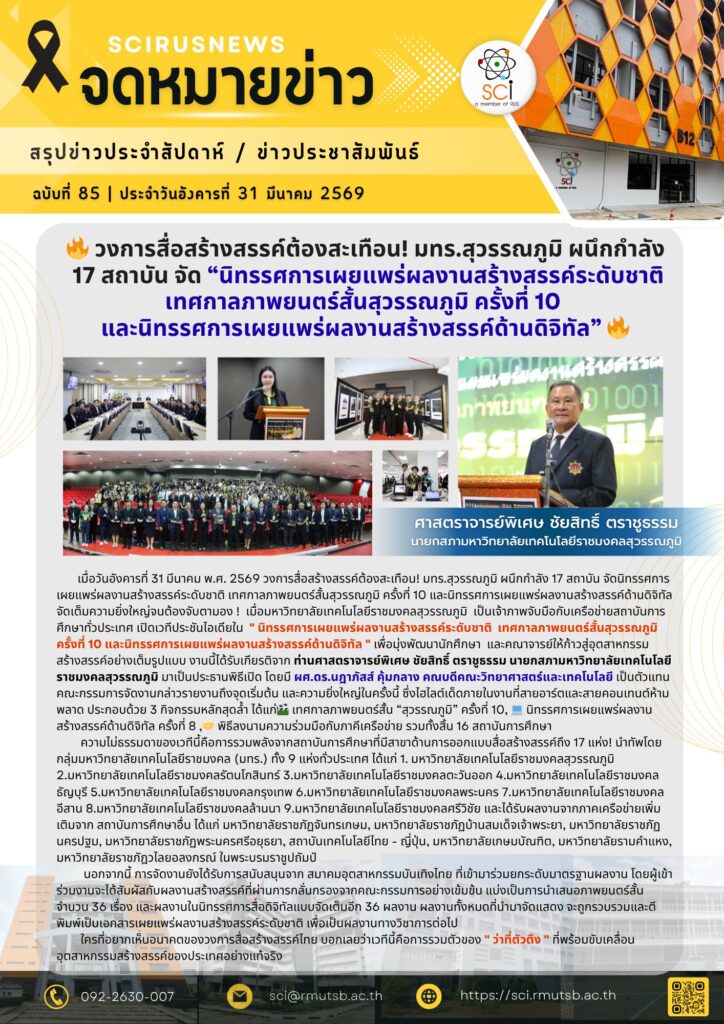 เมื่อวันอังคารที่ 31 มีนาคม พ.ศ. 2569 วงการสื่อสร้างสรรค์ต้องสะเทือน! มทร.สุวรรณภูมิ ผนึกกำลัง 17 สถาบัน จัดนิทรรศการเผยแพร่ผลงานสร้างสรรค์ระดับชาติ เทศกาลภาพยนตร์สั้นสุวรรณภูมิ ครั้งที่ 10 และนิทรรศการเผยแพร่ผลงานสร้างสรรค์ด้านดิจิทัล จัดเต็มความยิ่งใหญ่จนต้องจับตามอง ! เมื่อมหาวิทยาลัยเทคโนโลยีราชมงคลสุวรรณภูมิ เป็นเจ้าภาพจับมือกับเครือข่ายสถาบันการศึกษาทั่วประเทศ เปิดเวทีประชันไอเดียใน ” นิทรรศการเผยแพร่ผลงานสร้างสรรค์ระดับชาติ เทศกาลภาพยนตร์สั้นสุวรรณภูมิ ครั้งที่ 10 และนิทรรศการเผยแพร่ผลงานสร้างสรรค์ด้านดิจิทัล ” เพื่อมุ่งพัฒนานักศึกษา และคณาจารย์ให้ก้าวสู่อุตสาหกรรมสร้างสรรค์อย่างเต็มรูปแบบ งานนี้ได้รับเกียรติจาก ท่านศาสตราจารย์พิเศษ ชัยสิทธิ์ ตราชูธรรม นายกสภามหาวิทยาลัยเทคโนโลยีราชมงคลสุวรรณภูมิ มาเป็นประธานพิธีเปิด โดยมี ผศ.ดร.นฎาภัสส์ คุ้มกลาง คณบดีคณะวิทยาศาสตร์และเทคโนโลยี เป็นตัวแทนคณะกรรมการจัดงานกล่าวรายงานถึงจุดเริ่มต้น และความยิ่งใหญ่ในครั้งนี้ ซึ่งไฮไลต์เด็ดภายในงานที่สายอาร์ตและสายคอนเทนต์ห้ามพลาด ประกอบด้วย 3 กิจกรรมหลักสุดล้ำ ได้แก่ เทศกาลภาพยนตร์สั้น “สุวรรณภูมิ” ครั้งที่ 10, นิทรรศการเผยแพร่ผลงานสร้างสรรค์ด้านดิจิทัล ครั้งที่ 8 ,พิธีลงนามความร่วมมือกับภาคีเครือข่าย รวมทั้งสิ้น 16 สถาบันการศึกษา