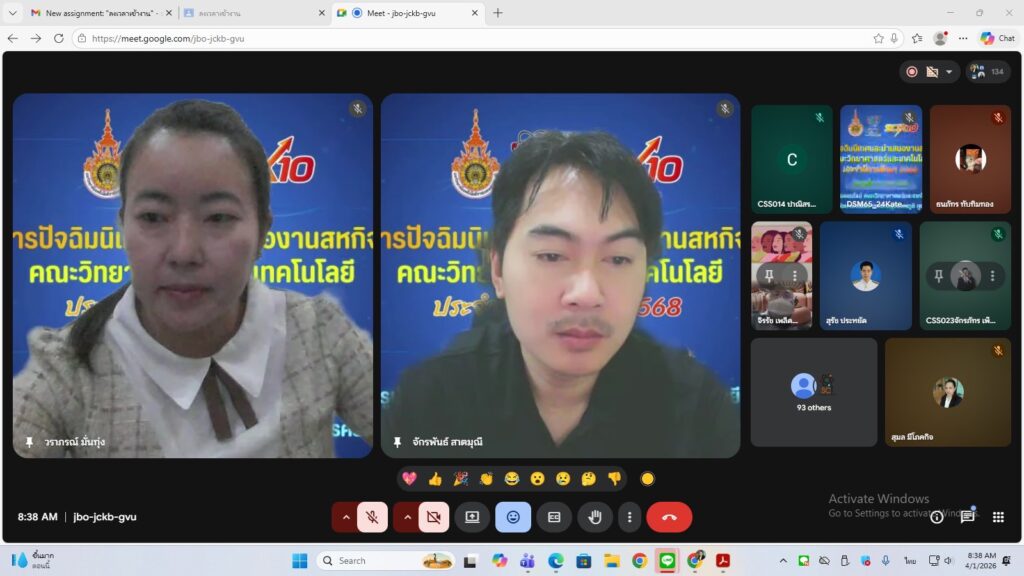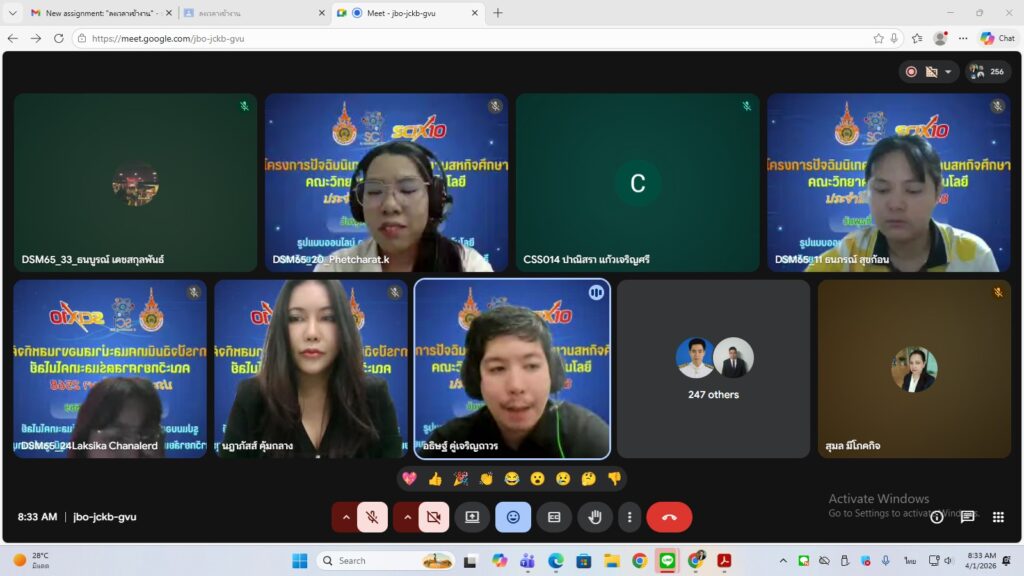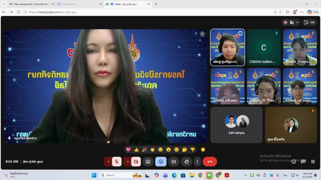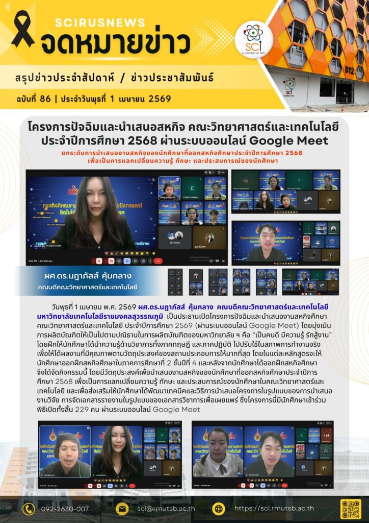 วันพุธที่ 1 เมษายน พ.ศ. 2569 ผศ.ดร.นฎาภัสส์ คุ้มกลาง คณบดีคณะวิทยาศาสตร์และเทคโนโลยี มหาวิทยาลัยเทคโนโลยีราชมงคลสุวรรณภูมิ เป็นประธานเปิดโครงการปัจฉิมและนำเสนองานสหกิจศึกษา คณะวิทยาศาสตร์และเทคโนโลยี ประจำปีการศึกษา 2569 (ผ่านระบบออนไลน์ Google Meet) โดยมุ่งเน้นการผลิตบัณฑิตให้เป็นไปตามปณิธานของมหาวิทยาลัย ฯ คือ เป็นคนดี มีความรู้ รักสู้งาน โดยฝึกให้นักศึกษาได้นำความรู้ด้านวิชาการทั้งภาคทฤษฎี และภาคปฏิบัติ ไปปรับใช้ในสภาพการทำงานจริง เพื่อให้ได้ผลงานที่มีคุณภาพตามวัตถุประสงค์ของสถานประกอบการให้มากที่สุด โดยในแต่ละหลักสูตรจะให้นักศึกษาออกฝึกสหกิจศึกษาในภาคการศึกษาที่ 2 ชั้นปีที่ 4 และหลังจากนักศึกษาได้ออกฝึกสหกิจศึกษา จึงได้จัดกิจกรรมนี้ โดยมีวัตถุประสงค์เพื่อนำเสนองานสหกิจของนักศึกษาที่ออกสหกิจศึกษาประจำปีการศึกษา 2568 เพื่อเป็นการแลกเปลี่ยนความรู้ ทักษะ และประสบการณ์ของนักศึกษาในคณะวิทยาศาสตร์และเทคโนโลยี และเพื่อส่งเสริมให้นักศึกษาได้พัฒนาเทคนิคและวิธีการนำเสนอโครงการในรูปแบบของการนำเสนองานวิจัย การจัดเอกสารรายงานในรูปแบบของเอกสารวิชาการเพื่อเผยแพร่ ซึ่งโครงการนี้มีนักศึกษาเข้าร่วมพิธีเปิดทั้งสิ้น 229 คน ผ่านระบบออนไลน์ Google Meet
