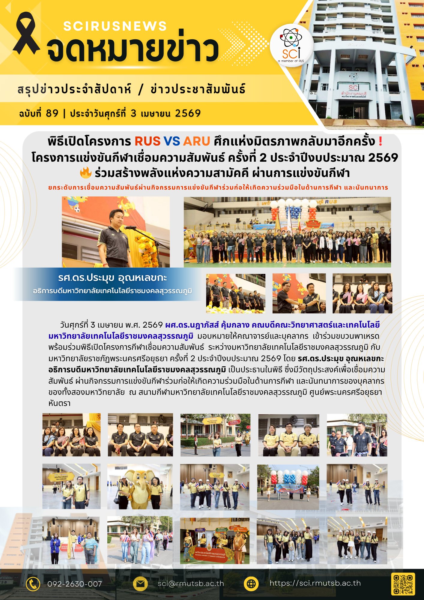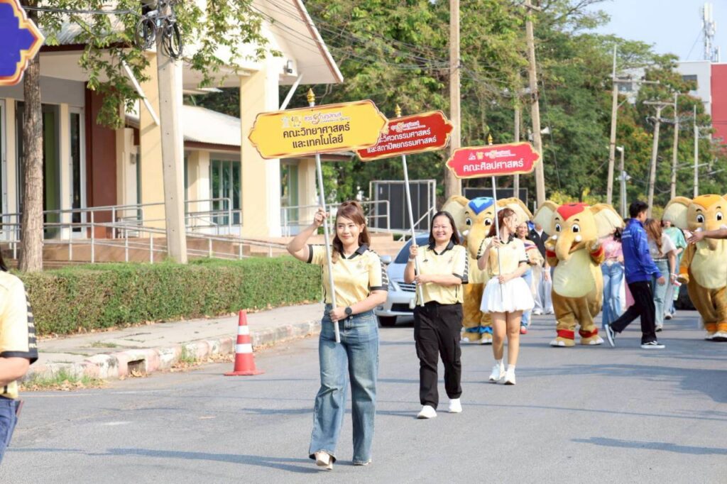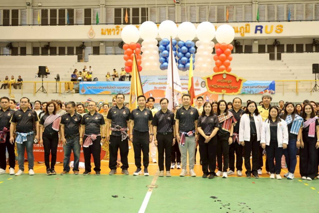 วันศุกร์ที่ 3 เมษายน พ.ศ. 2569 ผศ.ดร.นฎาภัสส์ คุ้มกลาง คณบดีคณะวิทยาศาสตร์และเทคโนโลยี มหาวิทยาลัยเทคโนโลยีราชมงคลสุวรรณภูมิ มอบหมายให้คณาจารย์และบุคลากร เข้าร่วมขบวนพาเหรด พร้อมร่วมพิธีเปิดโครงการกีฬาเชื่อมความสัมพันธ์ ระหว่างมหาวิทยาลัยเทคโนโลยีราชมงคลสุวรรณภูมิ กับ มหาวิทยาลัยราชภัฏพระนครศรีอยุธยา ครั้งที่ 2 ประจำปีงบประมาณ 2569 โดย รศ.ดร.ประมุข อุณหเลขกะ อธิการบดีมหาวิทยาลัยเทคโนโลยีราชมงคลสุวรรณภูมิ เป็นประธานในพิธี ซึ่งมีวัตถุประสงค์เพื่อเชื่อมความสัมพันธ์ ผ่านกิจกรรมการแข่งขันกีฬาร่วมก่อให้เกิดความร่วมมือในด้านการกีฬา และนันทนาการของบุคลากรของทั้งสองมหาวิทยาลัย ณ สนามกีฬามหาวิทยาลัยเทคโนโลยีราชมงคลสุวรรณภูมิ ศูนย์พระนครศรีอยุธยา หันตรา
