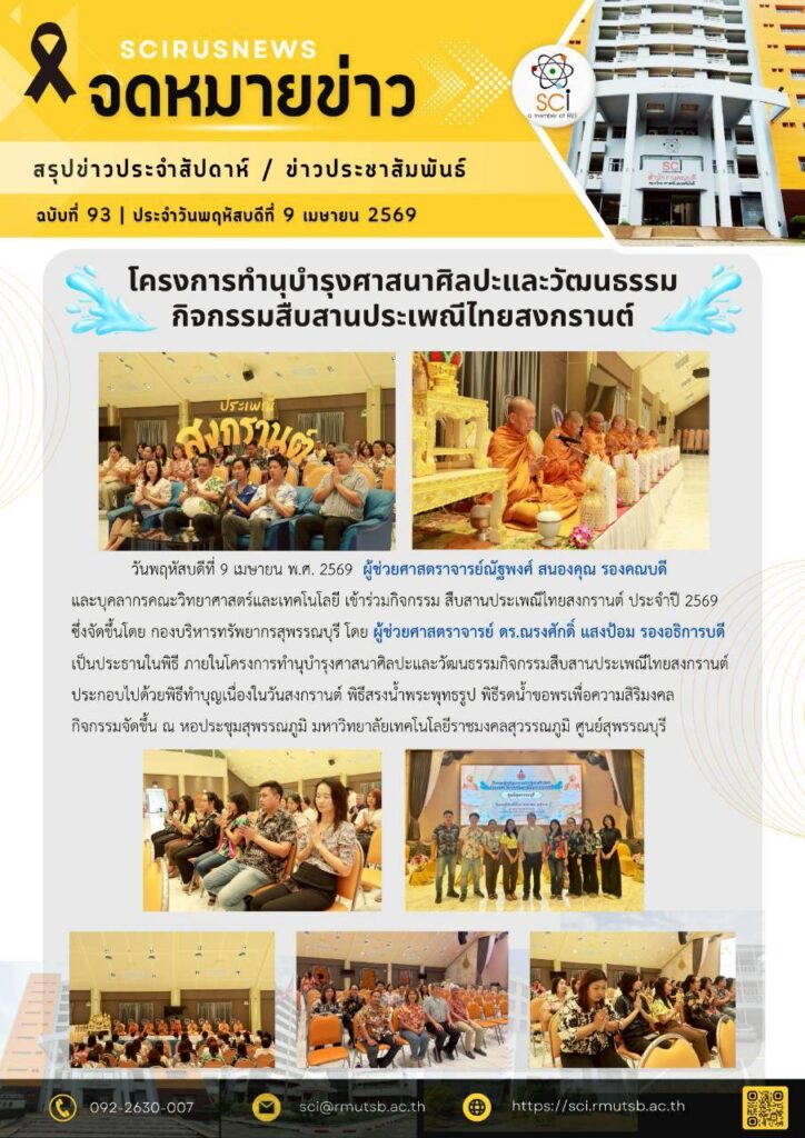 และบุคลากรคณะวิทยาศาสตร์และเทคโนโลยี เข้าร่วมกิจกรรม สืบสานประเพณีไทยสงกรานต์ ประจำปี 2569 ซึ่งจัดขึ้นโดย กองบริหารทรัพยากรสุพรรณบุรี โดย ผู้ช่วยศาสตราจารย์ ดร.ณรงศักดิ์ แสงป้อม รองอธิการบดี เป็นประธานในพิธี ภายในโครงการทำนุบำรุงศาสนาศิลปะและวัฒนธรรมกิจกรรมสืบสานประเพณีไทยสงกรานต์ ประกอบไปด้วยพิธีทำบุญเนื่องในวันสงกรานต์ พิธีสรงน้ำพระพุทธรูป พิธีรดน้ำขอพรเพื่อความสิริมงคล