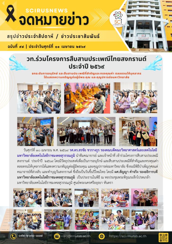 วันศุกร์ที่ ๑๐ เมษายน พ.ศ. ๒๕๖๙ รศ.ดร.สรชัย ชวรางกูร รองคณบดีคณะวิทยาศาสตร์และเทคโนโลยี มหาวิทยาลัยเทคโนโลยีราชมงคลสุวรรณภูมิ นำทีมคณาจารย์ และเจ้าหน้าที่ เข้าร่วมโครงการสืบสานประเพณีสงกรานต์ ประจำปี ๒๕๖๙ โดยมีวัตถุประสงค์เพื่อเป็นการอนุรักษ์ และสืบสานประเพณีที่สำคัญและทรงคุณค่า ตลอดจนให้บุคลากรได้แสดงความกตัญญูต่อผู้มีพระคุณ และคุณูปการต่อมหาวิทยาลัย ซึ่งจะมีพิธีบำเพ็ญกุศลแด่คณาจารย์ที่ล่วงลับ และทำบุญวันสงกรานต์ ซึ่งถือเป็นวันขึ้นปีใหม่ไทย โดยมี ผศ.สัญญา คำจริง รองอธิการบดี มหาวิทยาลัยเทคโนโลยีราชมงคลสุวรรณภูมิ เป็นประธานในพิธี ณ หอประชุมพระพิรุณระลึกโปรดเกล้า มหาวิทยาลัยเทคโนโลยีราชมงคลสุวรรณภูมิ ศูนย์พระนครศรีอยุธยา หันตรา