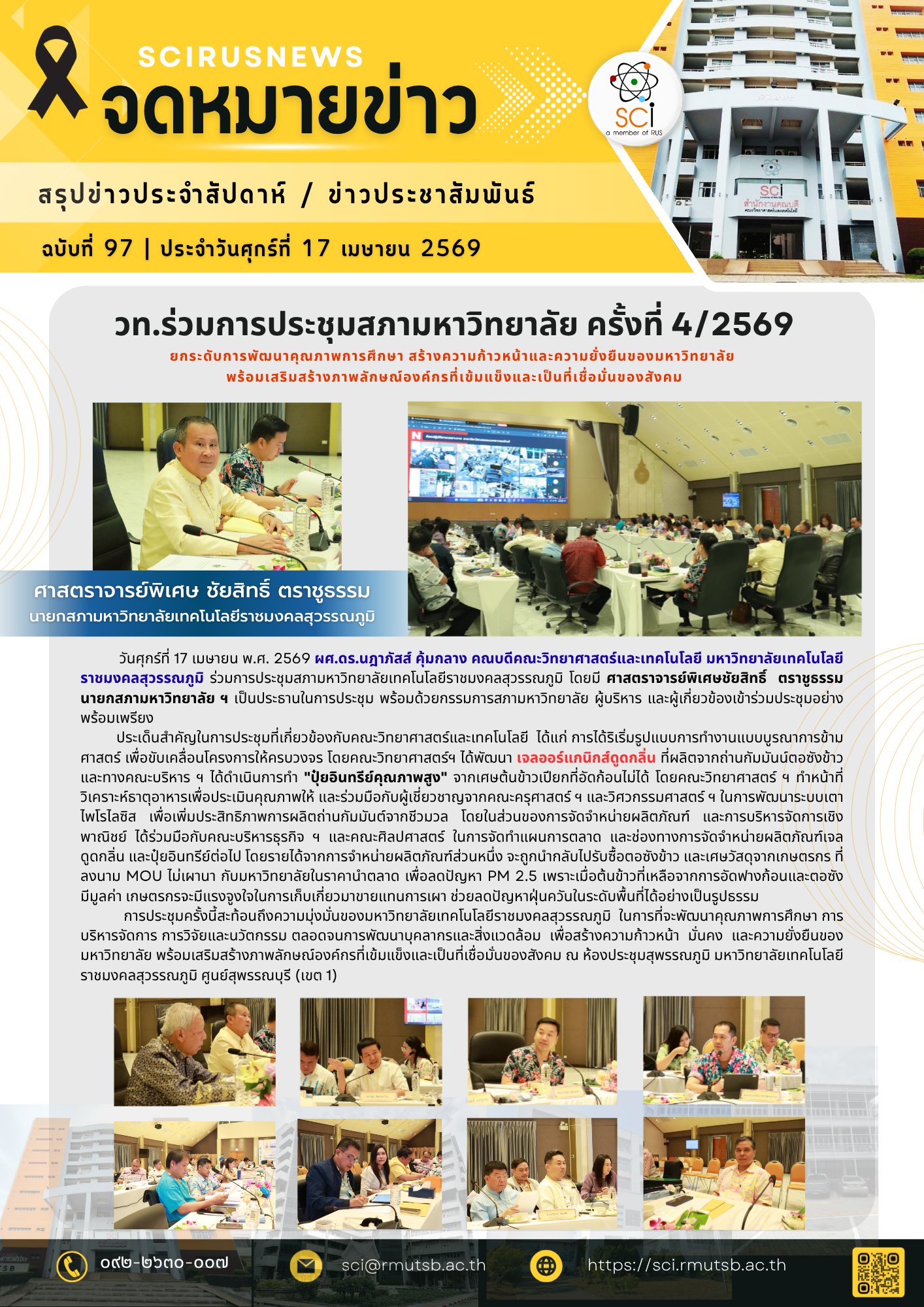 วันศุกร์ที่ 17 เมษายน พ.ศ. 2569 ผศ.ดร.นฎาภัสส์ คุ้มกลาง คณบดีคณะวิทยาศาสตร์และเทคโนโลยี มหาวิทยาลัยเทคโนโลยี ราชมงคลสุวรรณภูมิ ร่วมการประชุมสภามหาวิทยาลัยเทคโนโลยีราชมงคลสุวรรณภูมิ โดยมี ศาสตราจารย์พิเศษชัยสิทธิ์ ตราชูธรรม นายกสภามหาวิทยาลัย ฯ เป็นประธานในการประชุม พร้อมด้วยกรรมการสภามหาวิทยาลัย ผู้บริหาร และผู้เกี่ยวข้องเข้าร่วมประชุมอย่างพร้อมเพรียง