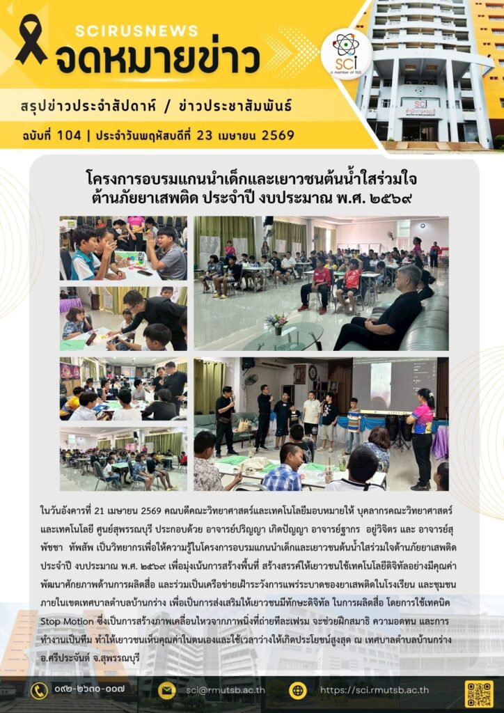 ในวันอังคารที่ 21 เมษายน 2569 คณบดีคณะวิทยาศาสตร์และเทคโนโลยีมอบหมายให้ บุคลากรคณะวิทยาศาสตร์และเทคโนโลยี ศูนย์สุพรรณบุรี ประกอบด้วย อาจารย์ปริญญา เกิดปัญญา อาจารย์ฐากร อยู่วิจิตร และ อาจารย์สุพัชชา ทัพสัพ เป็นวิทยากรเพื่อให้ความรู้ในโครงการอบรมแกนนำเด็กและเยาวชนต้นน้ำใสร่วมใจต้านภัยยาเสพติด ประจำปี งบประมาณ พ.ศ. ๒๕๖๙ เพื่อมุ่งเน้นการสร้างพื้นที่ สร้างสรรค์ให้เยาวชนใช้เทคโนโลยีดิจิทัลอย่างมีคุณค่า พัฒนาศักยภาพด้านการผลิตสื่อ และร่วมเป็นเครือข่ายเฝ้าระวังการแพร่ระบาดของยาเสพติดในโรงเรียน และชุมชนภายในเขตเทศบาลตำบลบ้านกร่าง เพื่อเป็นการส่งเสริมให้เยาวชนมีทักษะดิจิทัล ในการผลิตสื่อ โดยการใช้เทคนิค Stop Motion ซึ่งเป็นการสร้างภาพเคลื่อนไหวจากภาพนิ่งที่ถ่ายทีละเฟรม จะช่วยฝึกสมาธิ ความอดทน และการทำงานเป็นทีม ทำให้เยาวชนเห็นคุณค่าในตนเองและใช้เวลาว่างให้เกิดประโยชน์สูงสุด ณ เทศบาลตำบลบ้านกร่าง อ.ศรีประจันต์ จ.สุพรรณบุรี