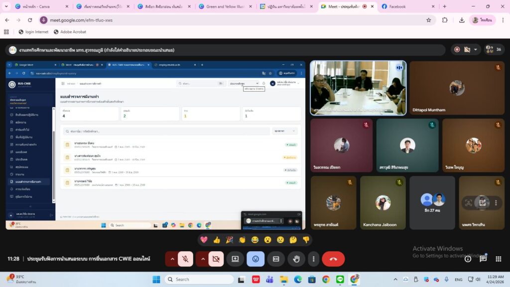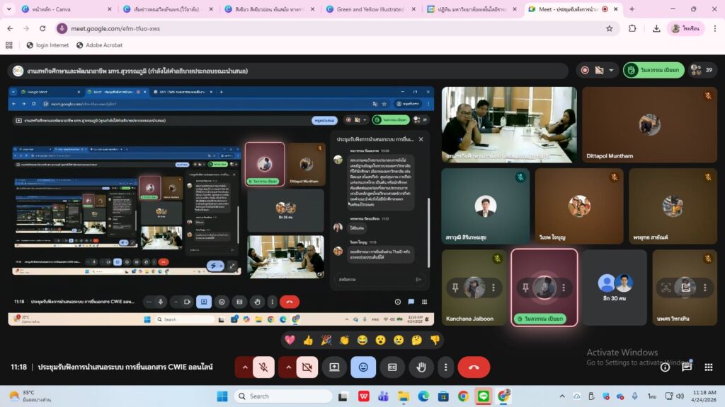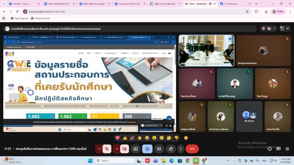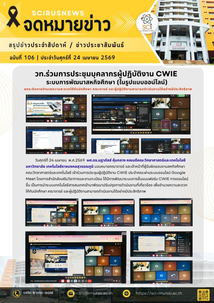 วันศุกร์ที่ 24 เมษายน พ.ศ.2569 ผศ.ดร.นฎาภัสส์ คุ้มกลาง คณบดีคณะวิทยาศาสตร์และเทคโนโลยี มหาวิทยาลัย เทคโนโลยีราชมงคลสุวรรณภูมิ มอบหมายคณาจารย์ และเจ้าหน้าที่ผู้รับผิดชอบงานสหกิจศึกษา คณะวิทยาศาสตร์และเทคโนโลยี เข้าร่วมการประชุมผู้ปฎิบัติงาน CWIE ประจำคณะผ่านระบบออนไลน์ Google Meet โดยทางสำนักส่งเสริมวิชาการและงานทะเบียน ได้มีการพัฒนาระบบการยื่นแบบฟอร์ม CWIE ทางออนไลน์ขึ้น เป็นการนำระบบเทคโนโลยีสารสนเทศเข้ามาพัฒนาปรับปรุงการดำเนินงานที่เกี่ยวข้อง เพื่ออำนวยความสะดวกให้กับนักศึกษา คณาจารย์ และผู้ปฏิบัติงานสามารถดำเนินงานได้อย่างมีประสิทธิภาพ